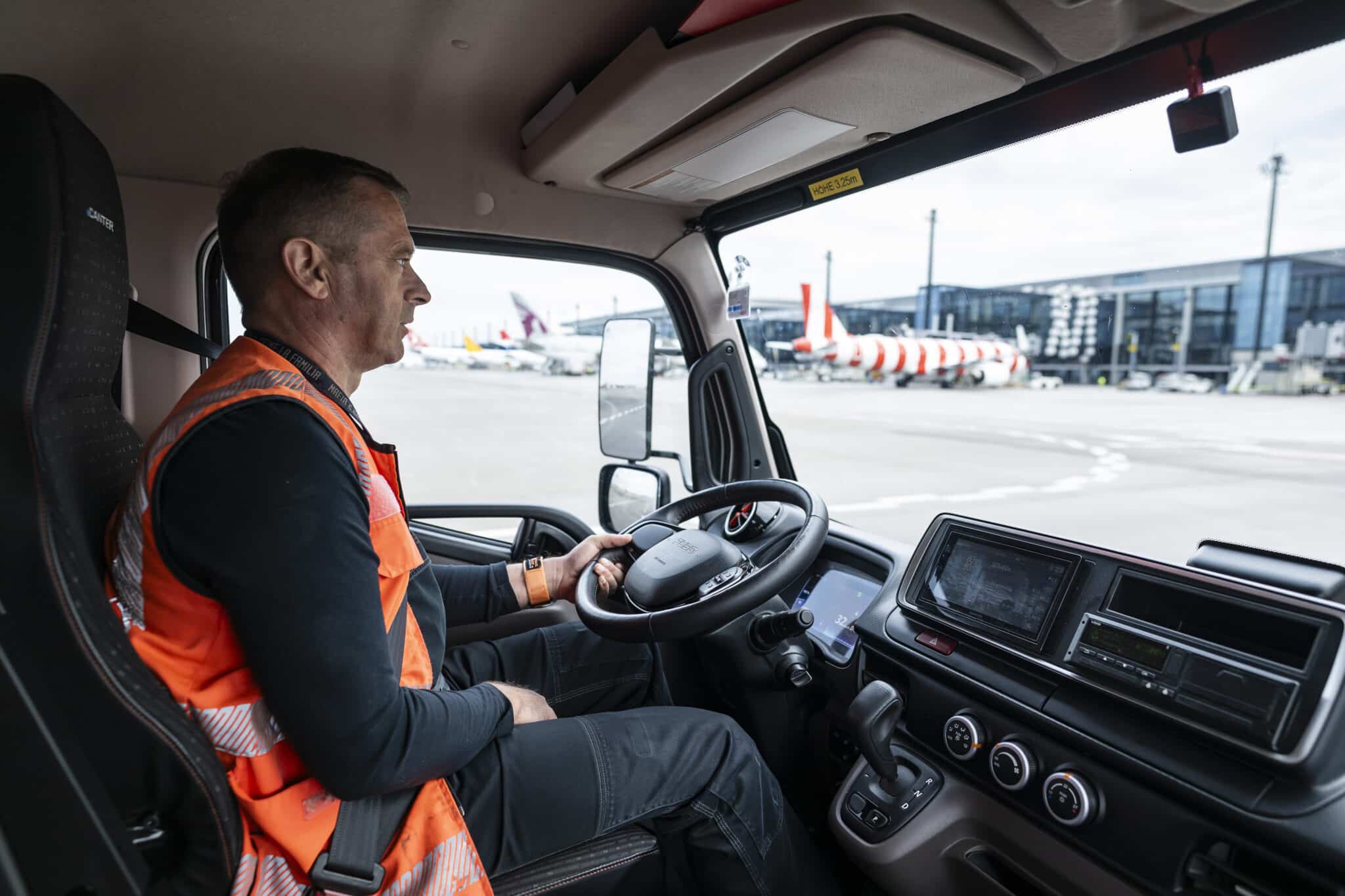 While the eCanter is obviously exactly the right electric truck for the job in waste management at the BER, the job as a driver also entails a few specific requirements. The eCanter not only drives to waste collection points on the publicly accessible land side, but also to those on the so-called air side behind the security control. Every employee who has access to it requires a complete security clearance. This reliability check is carried out by the aviation security authority and links background information about the person from various authorities such as the police, constitutional protection and the Federal Criminal Office. Anyone travelling with a vehicle on the supply roads of the apron also needs a special airport driving licence with theoretical and practical lessons, as well as an examination. Incidentally, there is of course a flash in the run-up to the event.