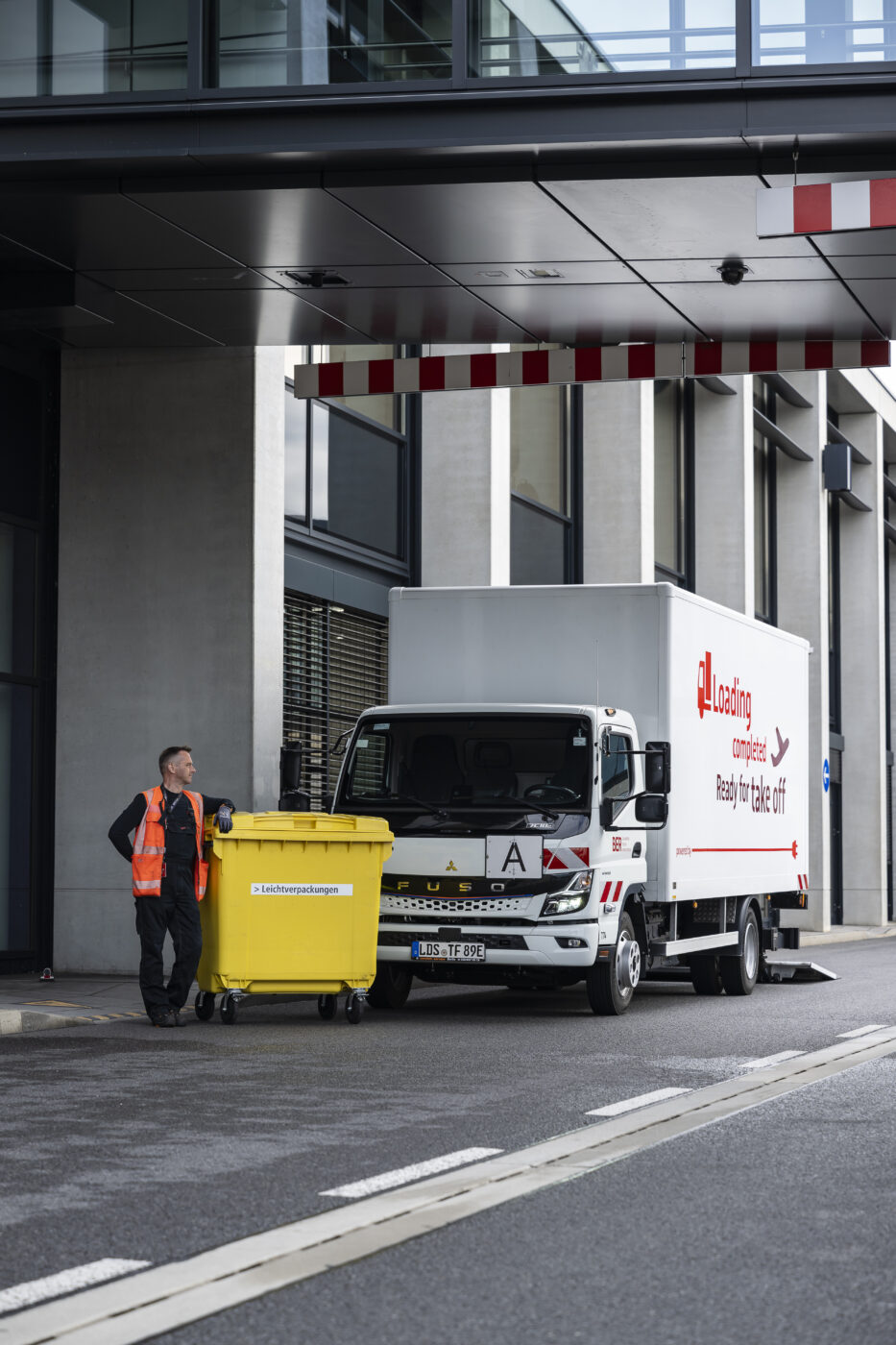 One thing was clear: a diesel vehicle should not be used again, because they are not used to full capacity on the short routes and are therefore too maintenance-intensive. After detailed analysis, the key data was clear: 7.5-tonne truck, minimum 70 kilometres per day range, box body with 1-tonne tail lift, at least 2 tonnes payload plus around 25 cubic metres of load volume for a wide range of containers. “I have to admit, FUSO wasn’t on my screen at first,” says the waste specialist, “but compared to other providers, I found that thanks to its many configuration options, I was able to tailor the eCanter exactly to our needs. That’s just perfect.” Meanwhile, the eCanter 7C18e has been on the airport grounds for one and a half years, has already been around all seasons and runs flawlessly.